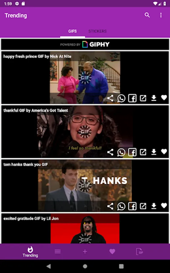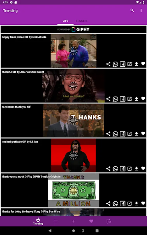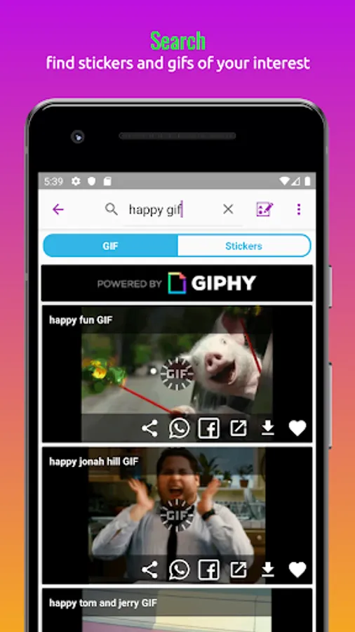 Get all the trending gifs and stickers from GIPHY site and able to download to device and share to all social media applications.
