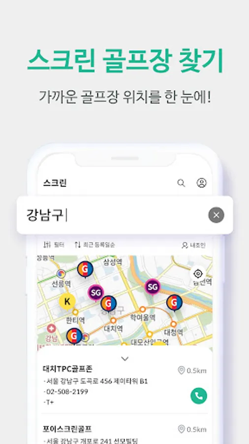 Check the golf course location at a glance on the map screen and check the nearest golf course.