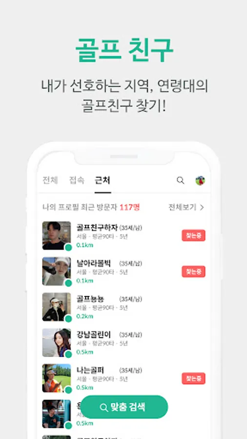 You can find currently connected golf friends / nearby golf friends / golf friends with various conditions.