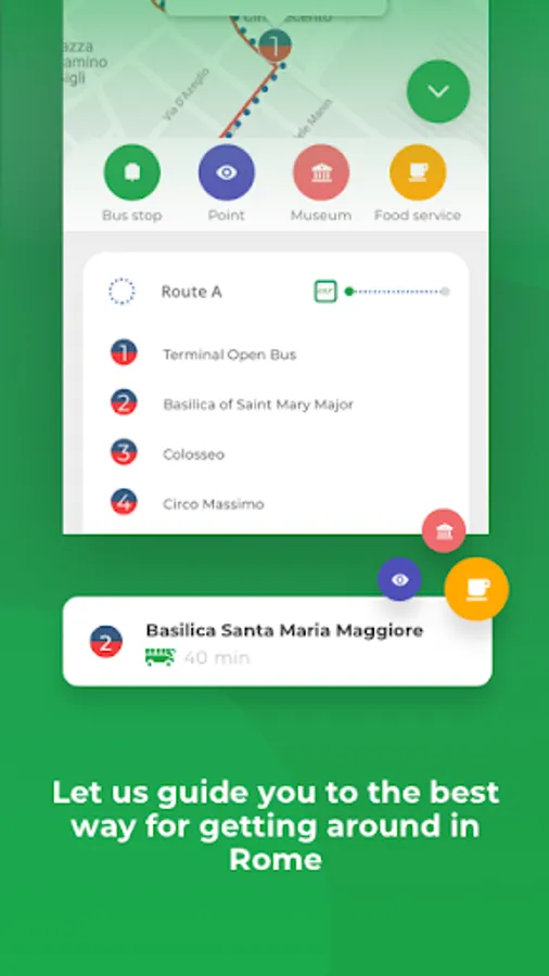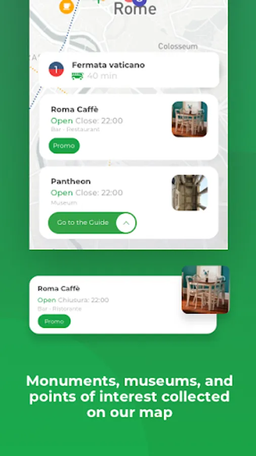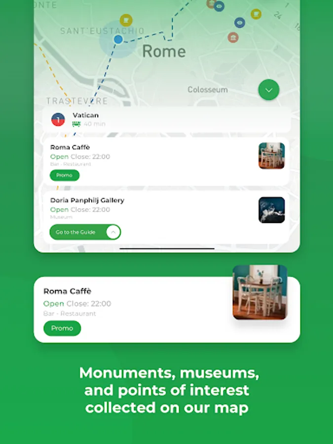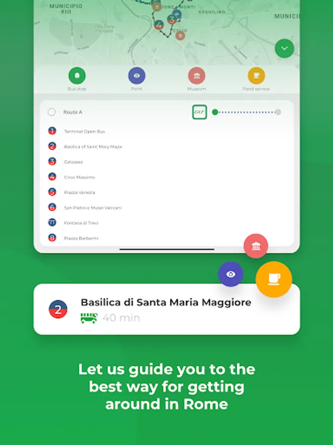 - LEAVE the city map also active OFFLINE, track the major sights of interest connected to all the stops on the Hop On Hop Off tour. You can also enjoy the story of the Sights outside the path of the Green Open Bus but within walking distance, near every stop thanks to the GPS function. Ex: you can approach the municipal Rose Garden, rather than Ara Pacisa or Vatican City, moving freely on excursions out of town.