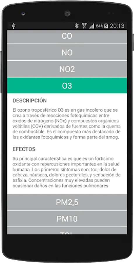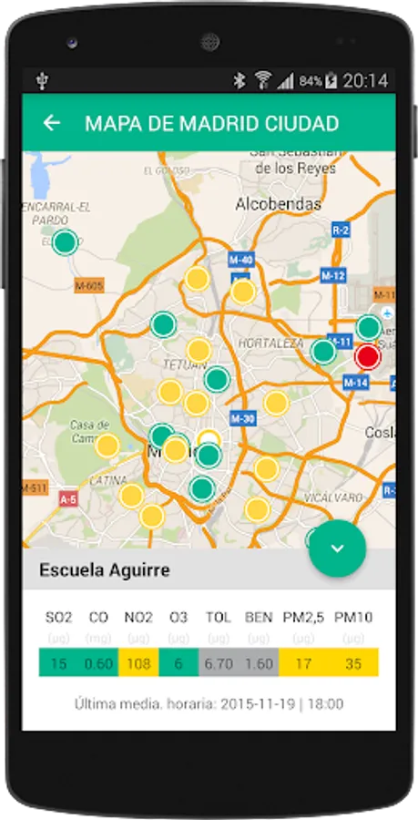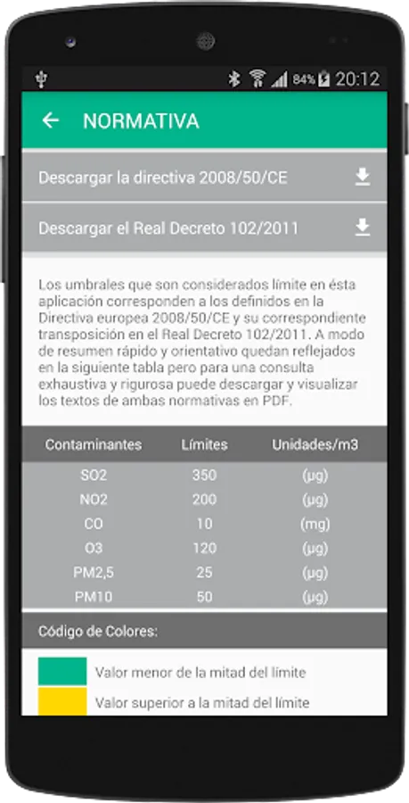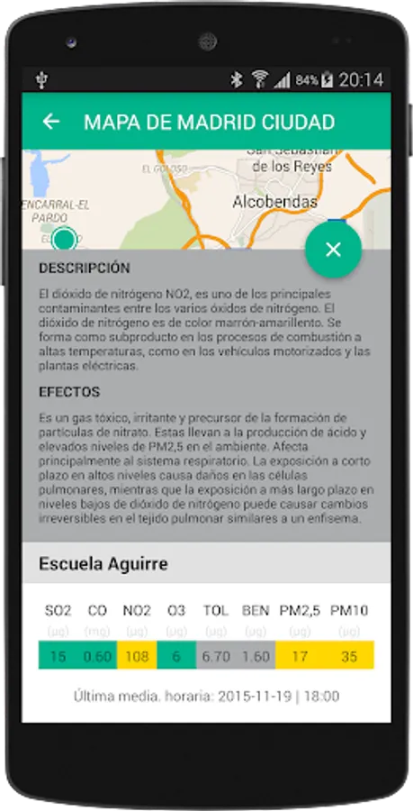 This application is intended as a tool to think about for anyone residing or visiting not only Madrid but also the autonomous region. With it you can learn the latest available average hourly real-time pollution levels from Surveillance Network of the City of Madrid and Surveillance Network of the Community of Madrid. Also information about pollutants and their consequences as well as the ability to download in PDF the European Regulatory Framework and National format for those more interested in the subject.