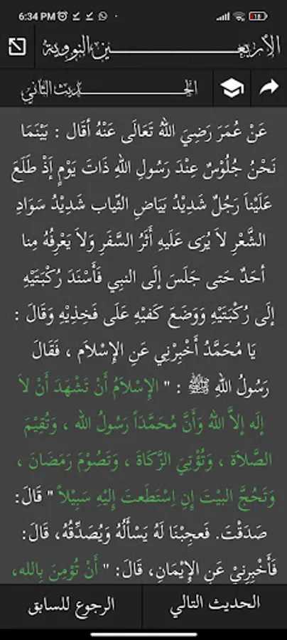 “Among the scholars gathered the forty in the fundamentals of the religion, some in the branches, some in jihad, some in asceticism and some in sermons, and all of them are good intentions, may God be pleased with those who seek them. I have seen the collection of forty more important than all of this, and it is forty hadiths that include all of that, and each hadith is a great rule of the religion, and the scholars have described it as the orbit of Islam over it, or half of Islam, or a third of it, or so.