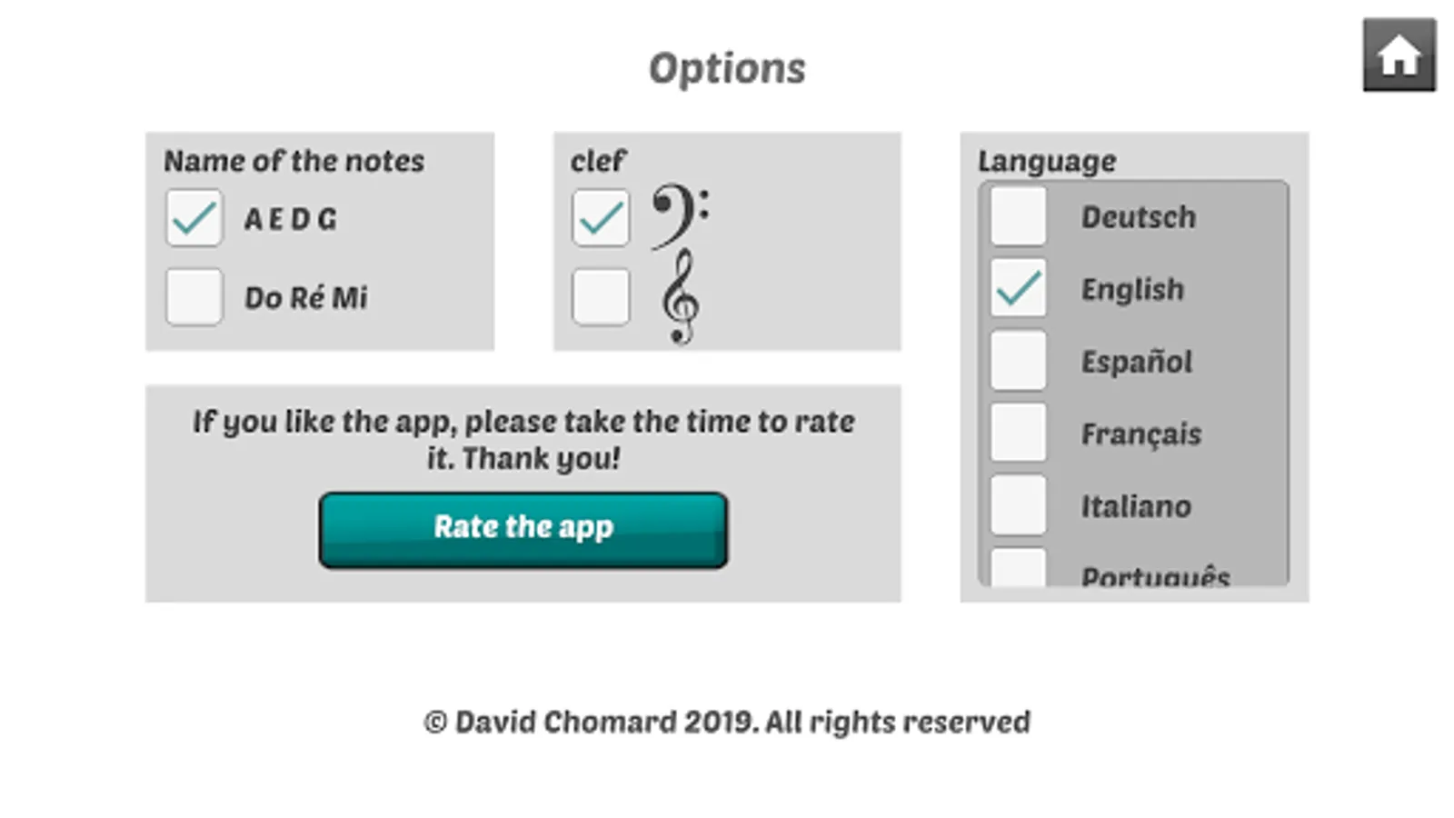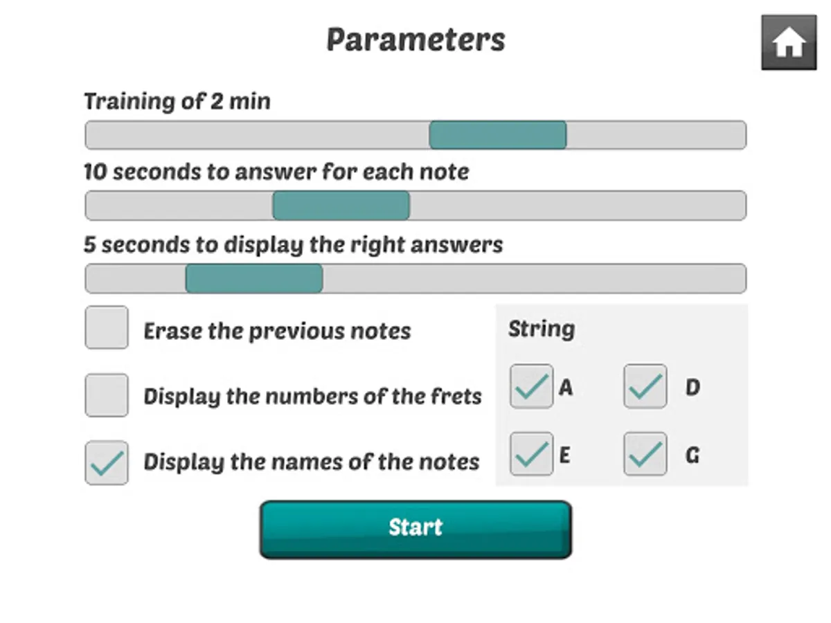- Selection of the strings to train: Practice just one string or the entire fretboard.
