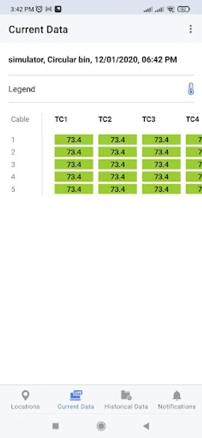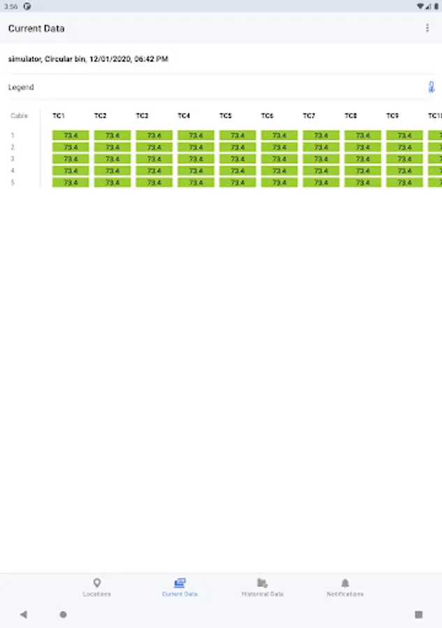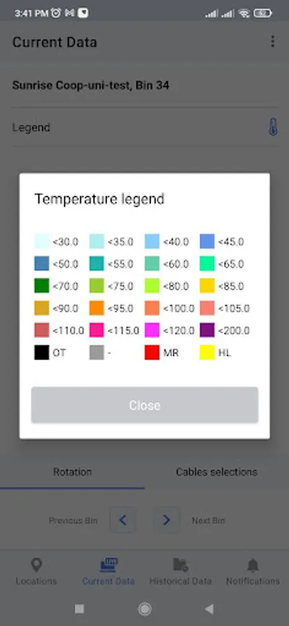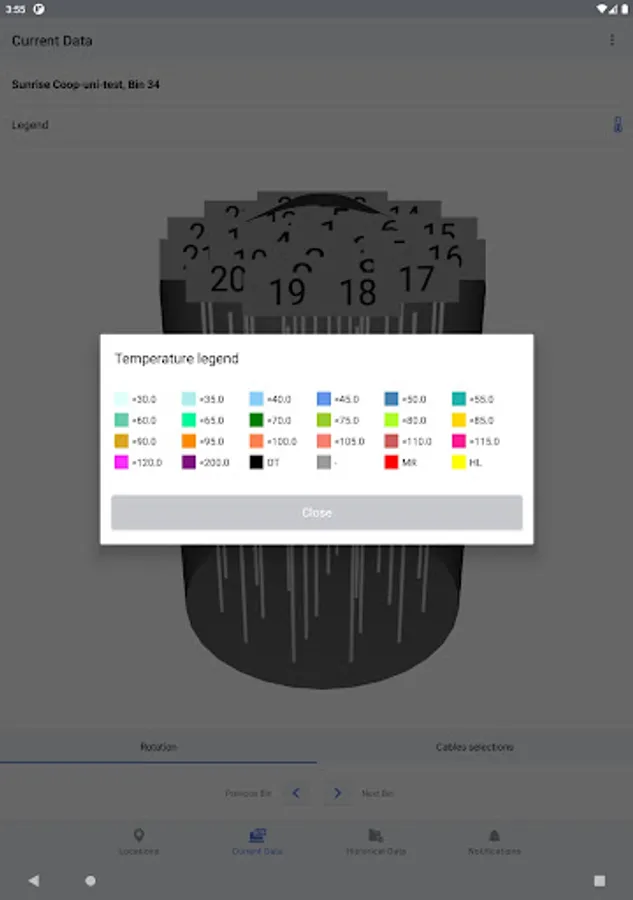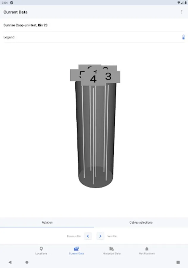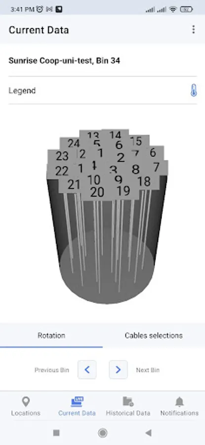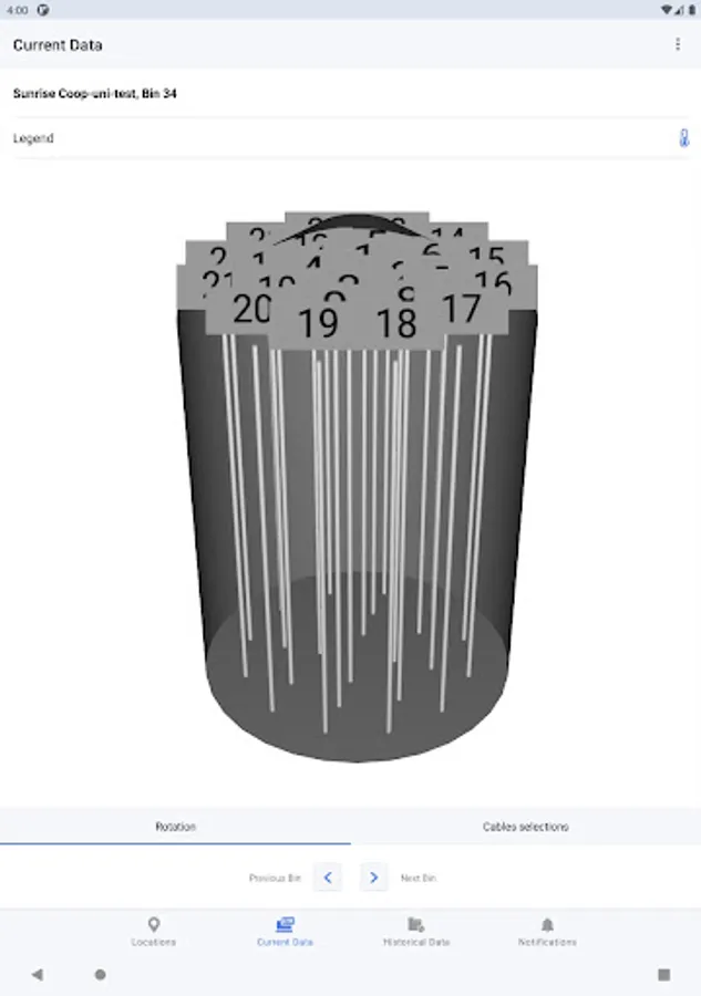 The Historical Data page allows users to view historical grain temperature information on the users’ mobile devices to analyze trends and view hot spot migration. Enables a user to compare the Current Data to the Historical Data.