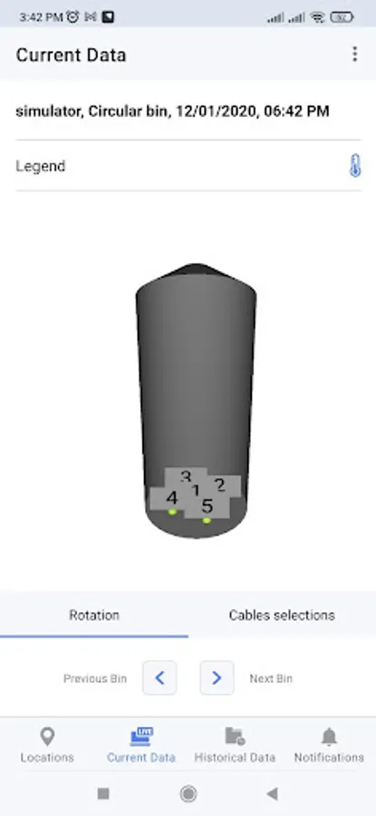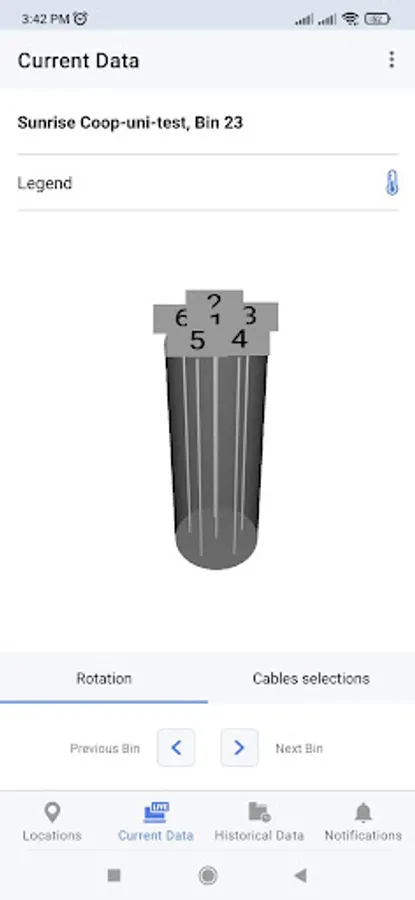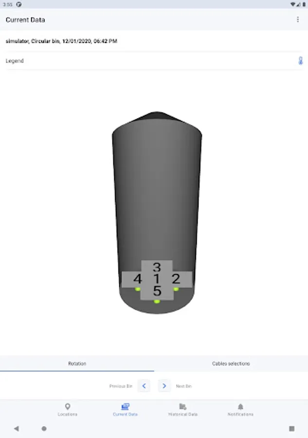 The Current Data page allows users to view the latest grain temperature data and alarm information in individual bins and for individual cables at any given location in 3D, 2D, and as a Table.