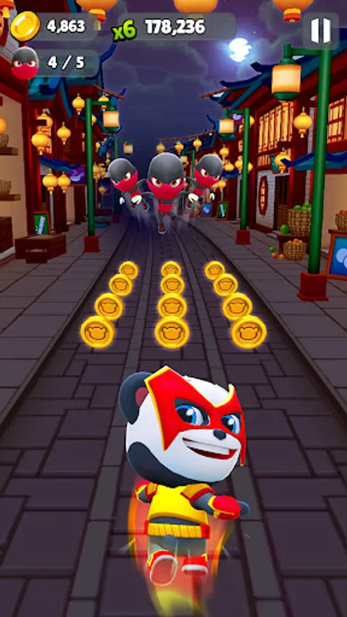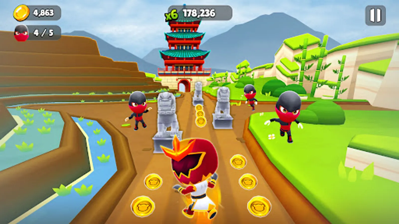 Panda Pi Hero must run and chase down the Ninja enemies, save the day and collect rewards and prizes. Defeat the Ninja enemies and Panda will receive free chests as a reward, open the chest to receive colourful gems. Use the gems to level up your time machine and discover new magical worlds and ages.