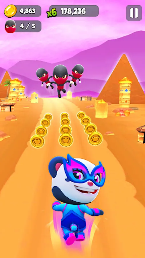 Take your cute superhero pet friends on a run adventure through time in the panda game. Race through Egypt, Wild West, Aztec and more collecting Gems to unlock new levels in this exciting running game.