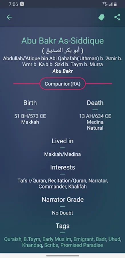 • Information like date of birth/death, places of stay, teacher and student list and narrator grade/rank provide useful details about hadeeth narrators.[More..]