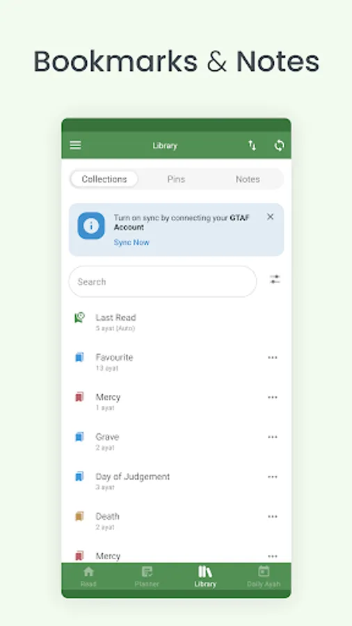 ● Bookmark ayahs to your own Collections and keep track of the last read ayah using Pins