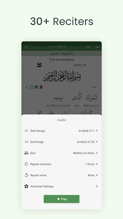 ● Listen to several recitations by 30+ reciters (downloadable for offline use)