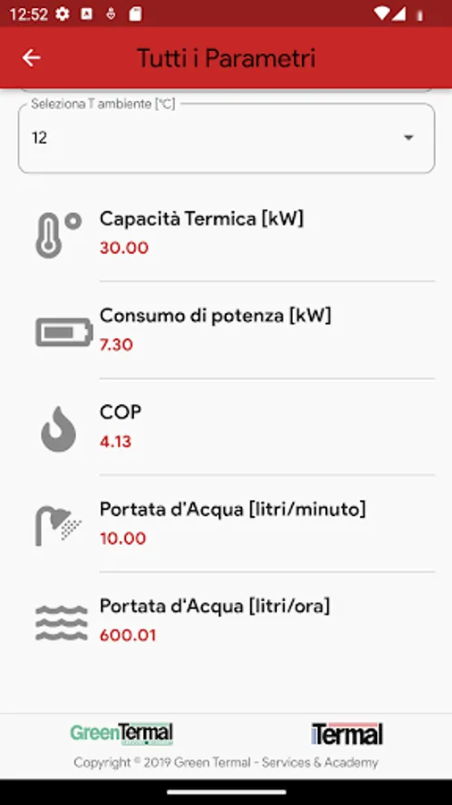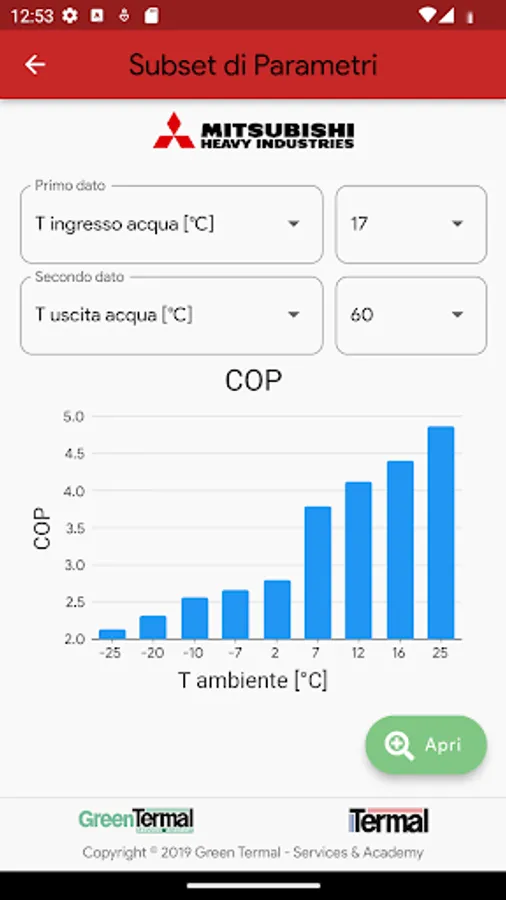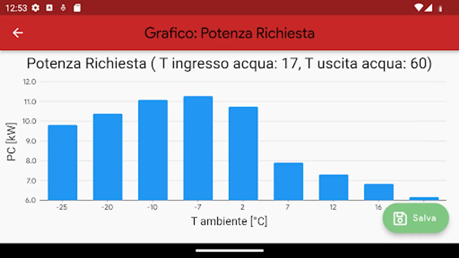 In the search for the best possible operation of the machine, there is also a section entirely dedicated to the trend of coefficients such as COP, thermal capacity supplied and electrical power absorbed as the ambient temperature, the network temperature and the DHW production temperature set on the machine vary .