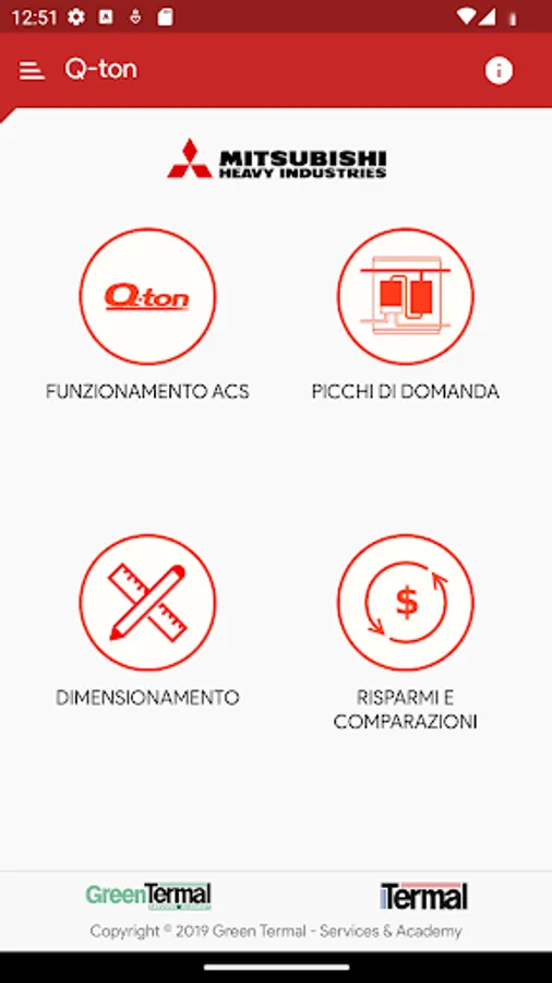 Depending on four different parameters pertaining to the external ambient temperature and the temperatures of the mains water, machine production and user use, values are returned regarding how many units to foresee to satisfy the daily requirement and how much accumulation volume to foresee to cope with peak loads. Finally, it is possible to compare the estimated amount of Q-Ton operating costs with those of a boiler of different types: although some data are already pre-compiled in accordance with an average value that can be found in a generic context, full freedom is left to the user to modify these parameters so as to optimize the hypothesis of economic return in his specific case.