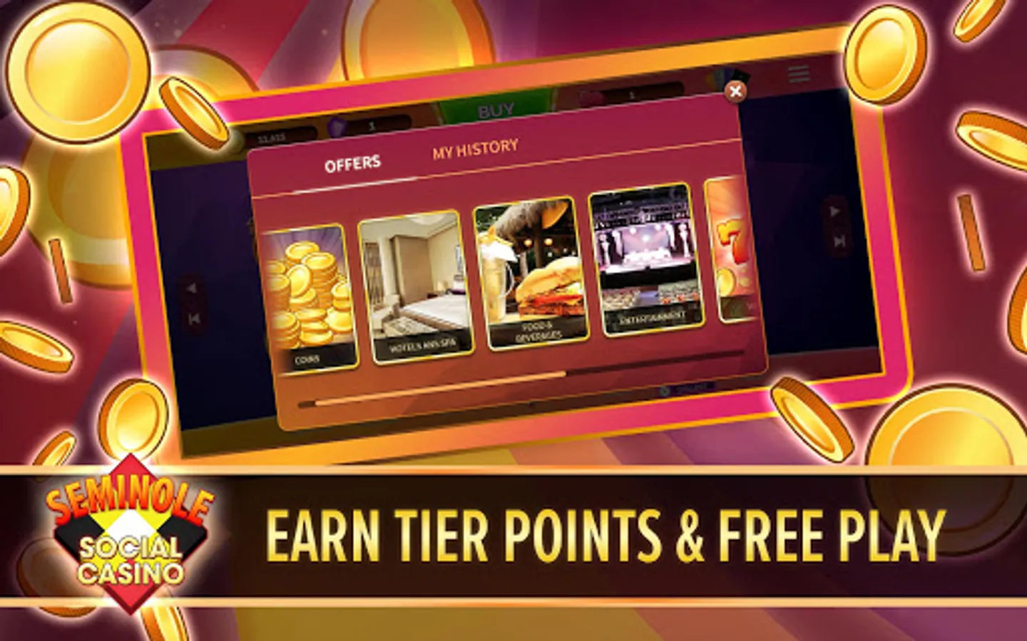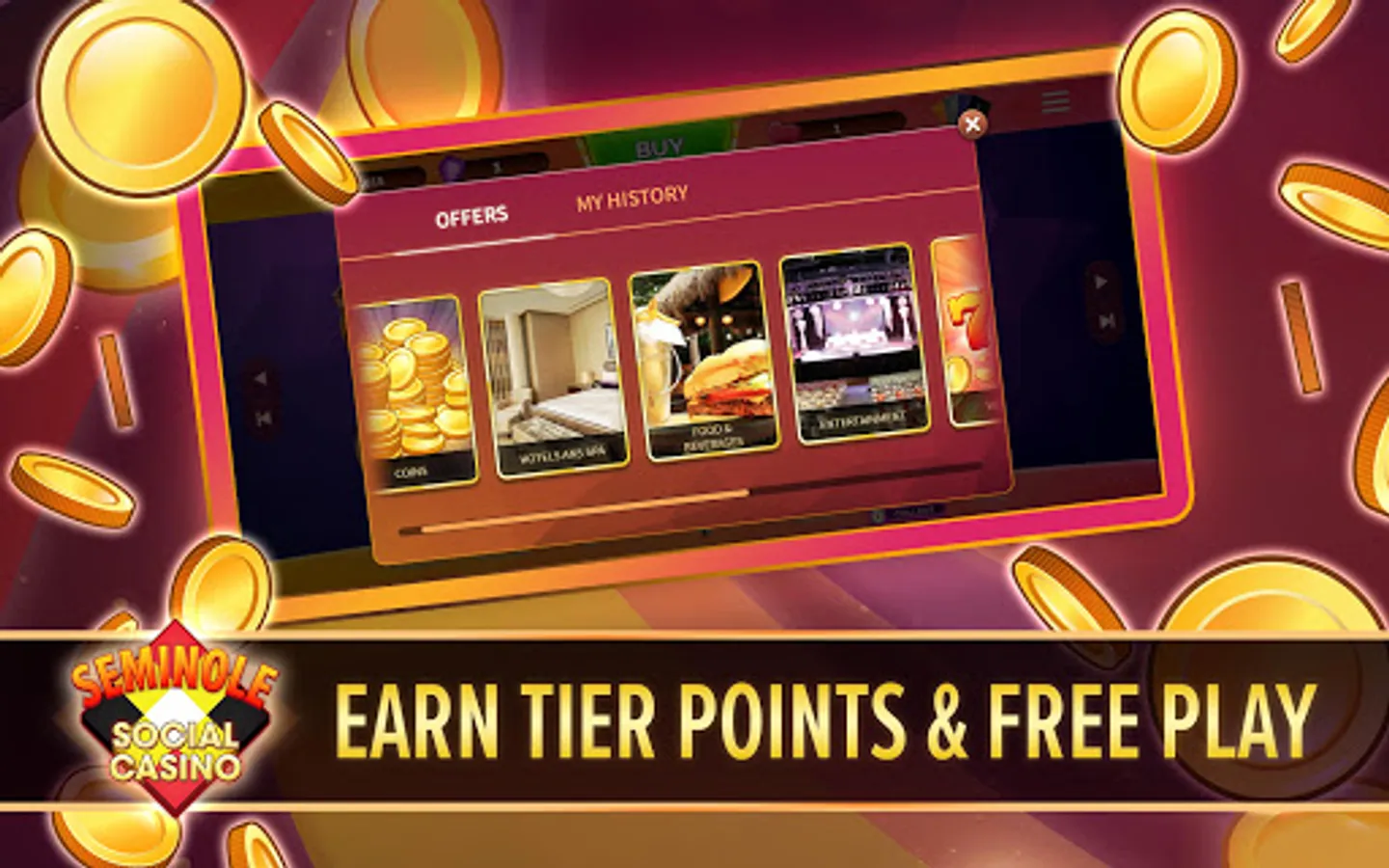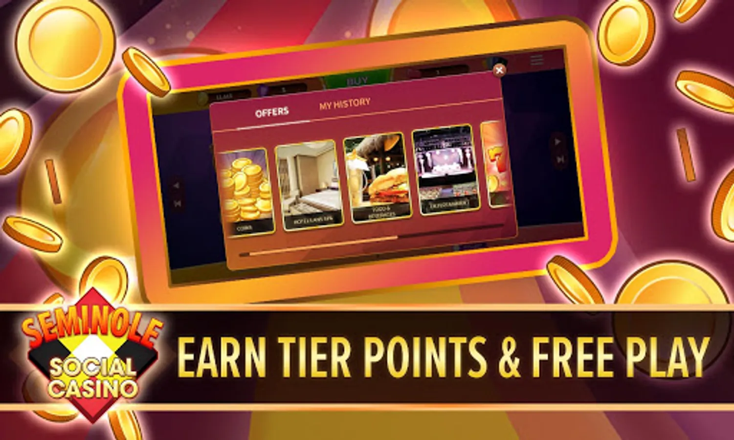 Earn Tier Points toward upgrading your Seminole Wild Card Tier Status on all in-game purchases! You will also earn additional loyalty points from purchases that can be exchanged for Real Casino Rewards, such as Casino Free Plays, Free Coins, and More!