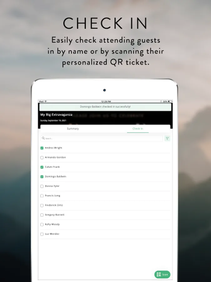 Utilize the EventWorks App to scan QR codes and check in guests that have tickets for an event created with Greenvelope.com.