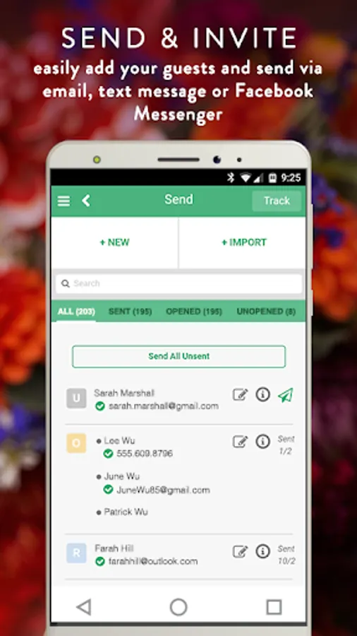Don’t have an email address for all your guests? No problem! Easily send your invitations via Facebook or text message.
