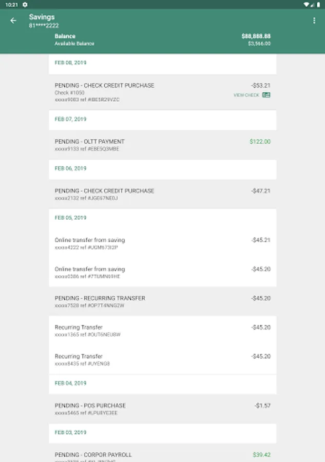 - Check your latest account balance and search recent transactions by date, amount, or check number.