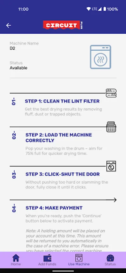 Make doing the laundry less of a hassle with a mobile app that's as easy-to-use as our washing machines and dryers! The Circuit Laundry Plus app lets you pay for your laundry in seconds...just turn up at your nearest Circuit launderette, load your laundry, choose your machine and payment method, select the programme you want to start - job done!