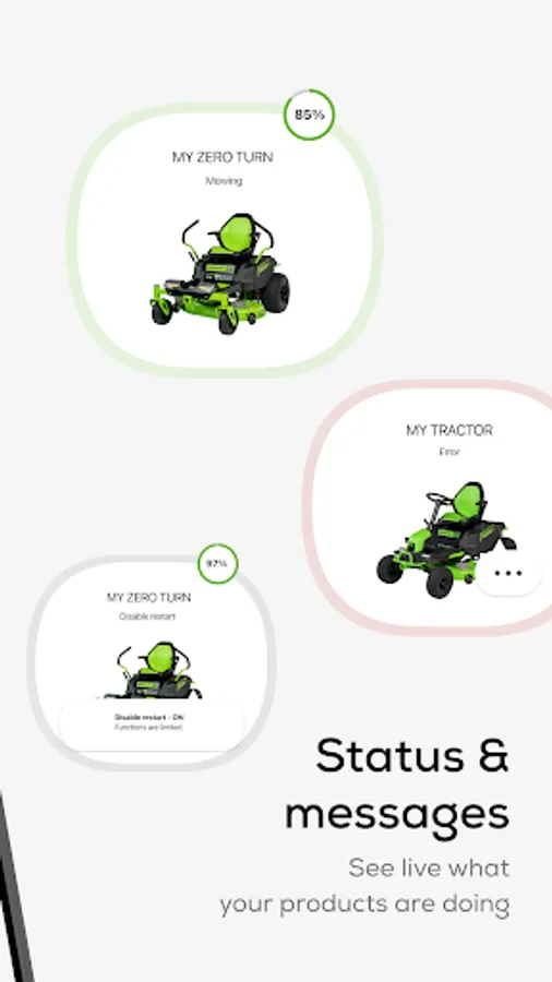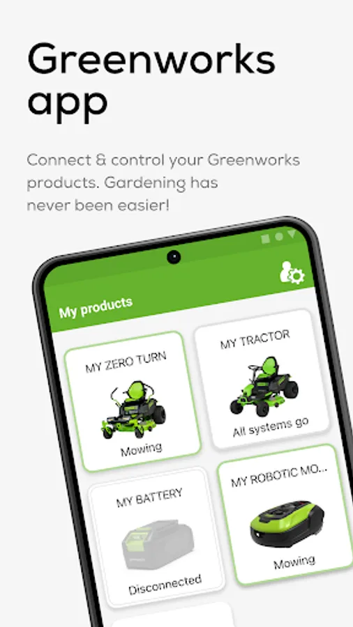The official Greenworks app provides useful tools for connecting and communicating with Greenworks and Greenworks Pro Optimow robotic lawn mowers, ride-on mowers, batteries, and more. The app is packed with useful tools and functions. Overall, you can register products, get digital copies of your owners manuals and much more.