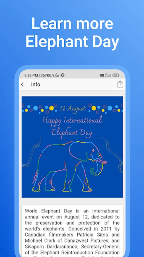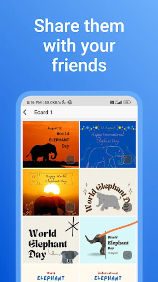 Download now World Elephant Day Greeting Cards and Wishes before we start charging. The app has thousands of greeting cards and we will update it with this greeting maker.