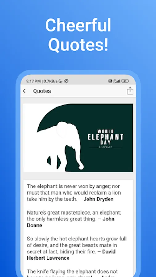 Elephant Day Greeting Cards and Wishes is all in one app greeting and wishes plus special quotes to celebrate the occasion. This is a celebration of sending greeting cards and wishes to all friends.
