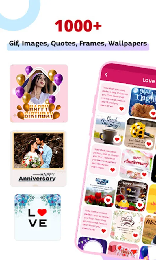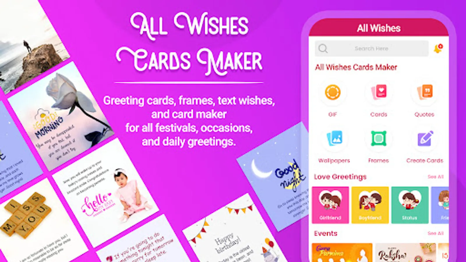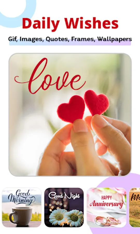 All Wishes Cards Maker Allows You To Share The Memorable And Beautiful All Greeting Cards like Good Morning , Good Night, Love, Anniversary, Birthday And All Festivals Wishes From This "All Wishes Cards Maker" App.