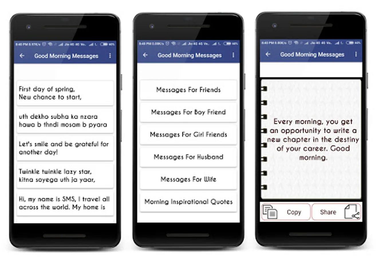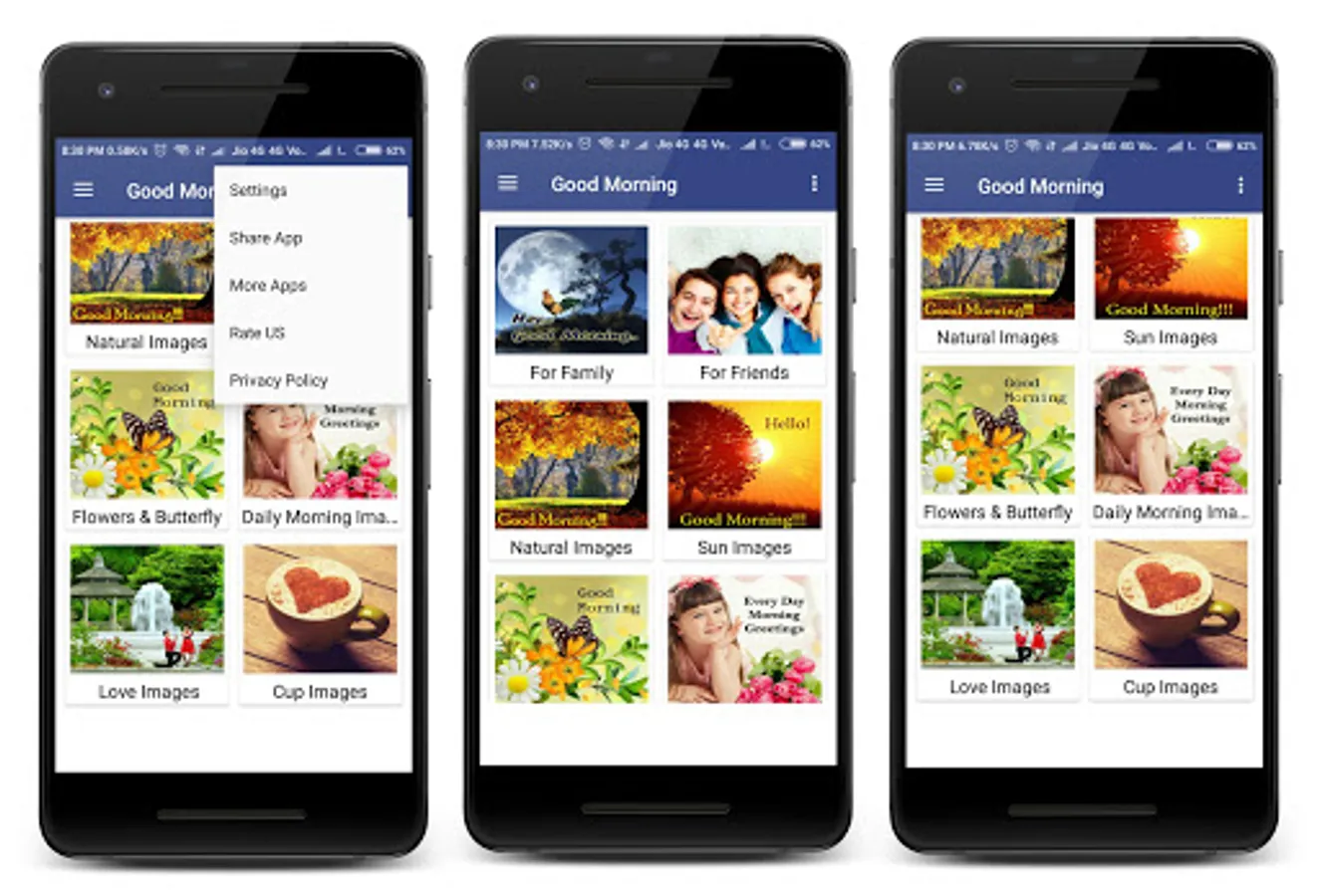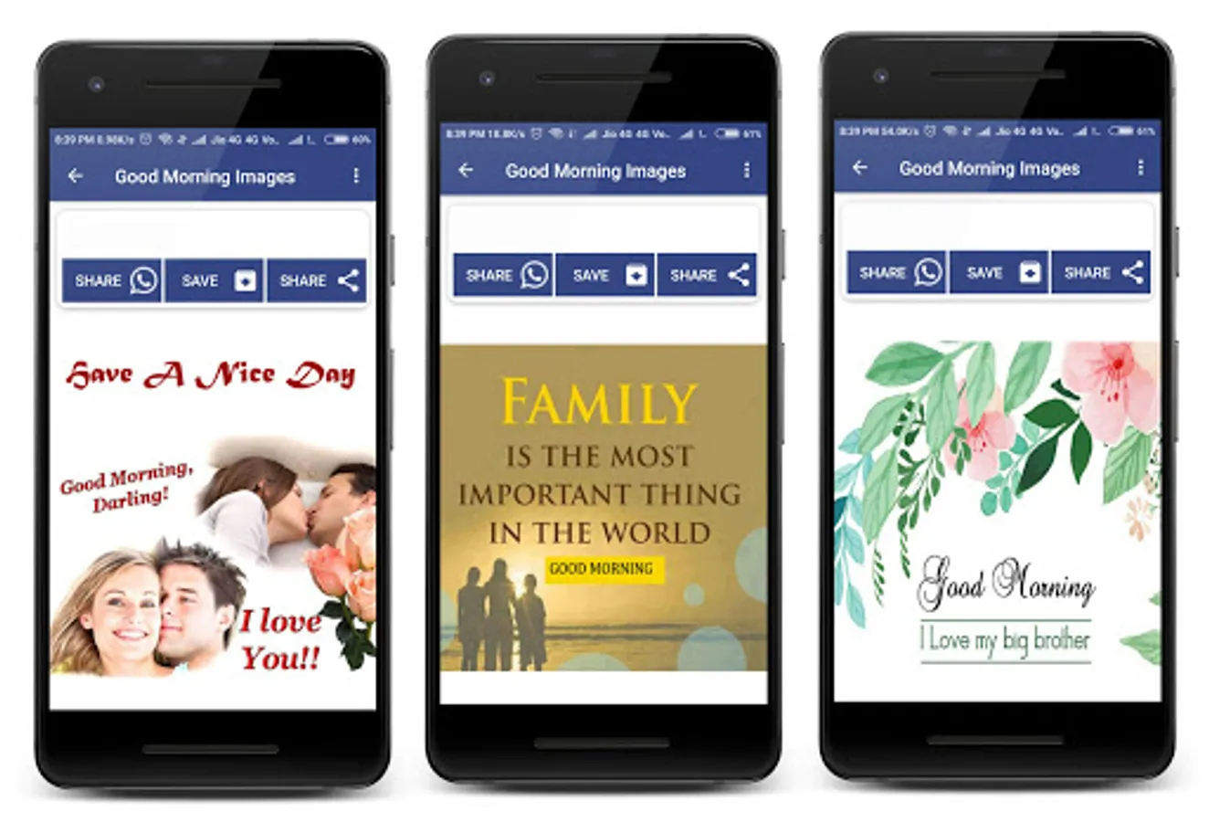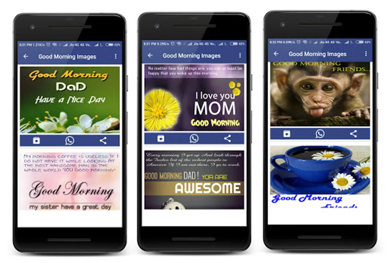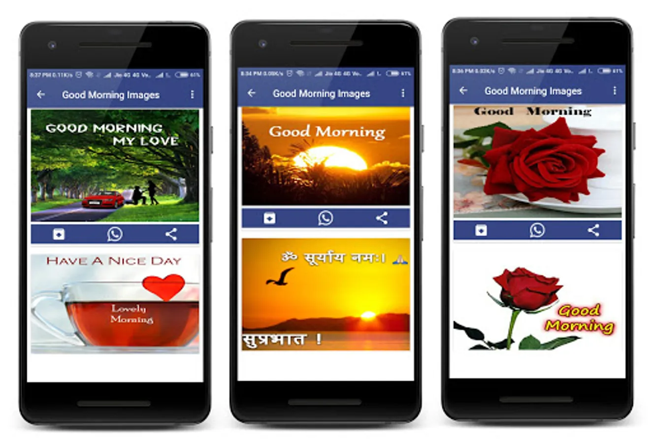 Good Morning application contain rich set of ready-made greetings images with attractive quotes for morning those greetings make your new day very successful.