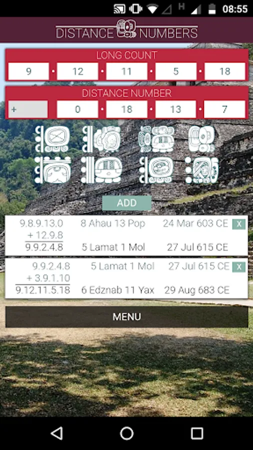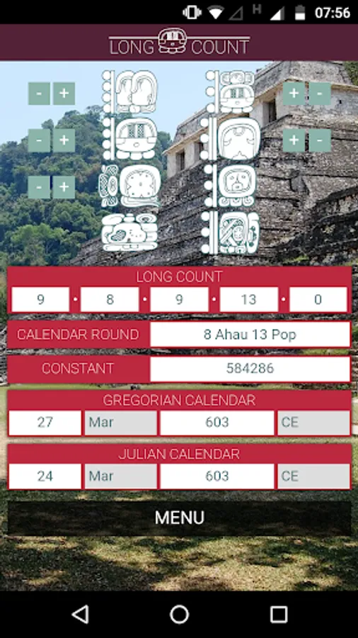 The Classic Maya developed the most sophisticated system for keeping track of time in the New World. In this app, you can convert dates from the Maya Calendar (Long Count and Calendar Round) to the Gregorian or Julian Calendars and vice-versa. You can also check the Maya glyphs for the current date. More features will be added in future versions.