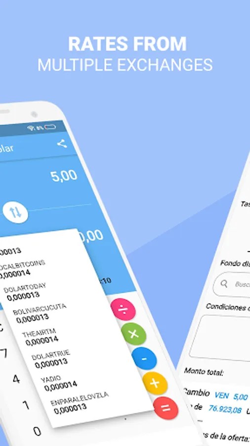 Allows you to quickly calculate exchanges between Dolares, Euros, Reales, Pesos, Soles, Bolívares, etc & viceversa.