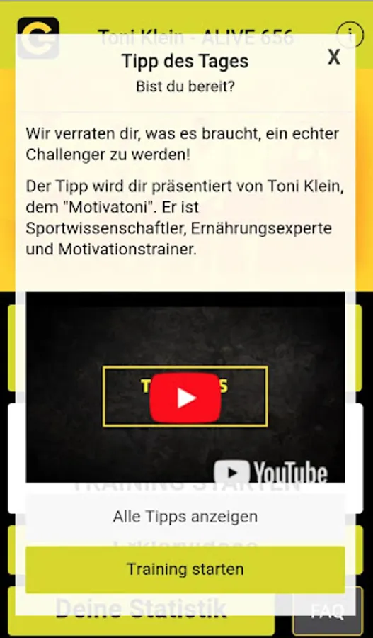 Every day you get a valuable tip on how you can create your personal goal in 6 weeks and your weaker self überwindest - full of information for optimal nutrition during the Challenge. Some tips you get with video message - presented by Toni Klein, the "Motivatoni" (sports science, nutrition expert, motivational speaker - known as TV coach and speaker at conferences)