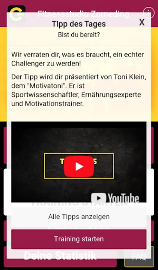 Every day you get a valuable tip on how you can create your personal goal in 6 weeks and your weaker self überwindest - full of information for optimal nutrition during the Challenge. Some tips you get with video message - presented by Toni Klein, the "Motivatoni" (sports science, nutrition expert, motivational speaker - known as TV coach and speaker at conferences)