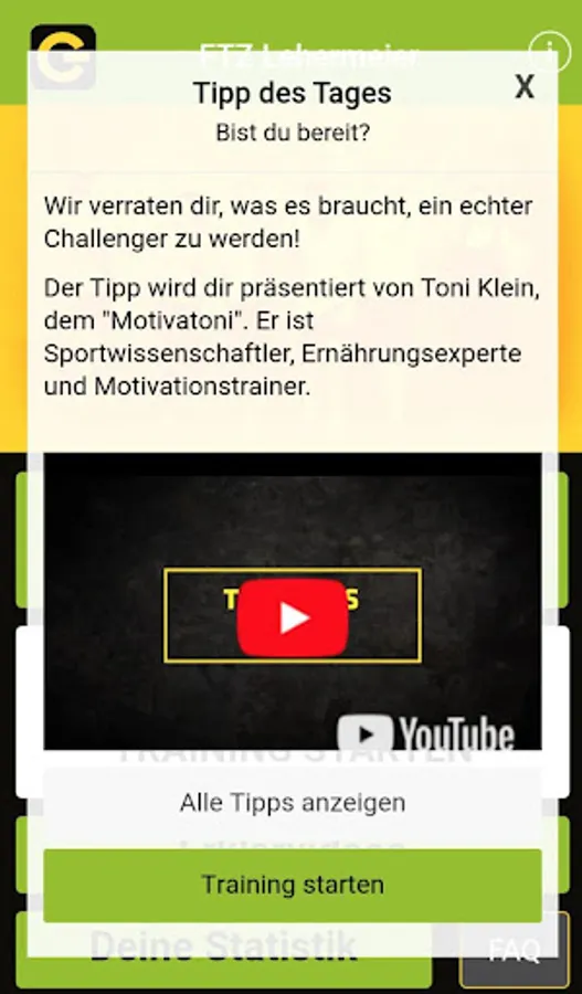 Every day you get a valuable tip on how you can create your personal goal in 6 weeks and your weaker self überwindest - full of information for optimal nutrition during the Challenge. Some tips you get with video message - presented by Toni Klein, the "Motivatoni" (sports science, nutrition expert, motivational speaker - known as TV coach and speaker at conferences)