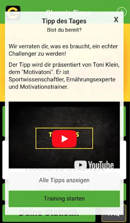 Every day you get a valuable tip on how you can create your personal goal in 6 weeks and your weaker self überwindest - full of information for optimal nutrition during the Challenge. Some tips you get with video message - presented by Toni Klein, the "Motivatoni" (sports science, nutrition expert, motivational speaker - known as TV coach and speaker at conferences)