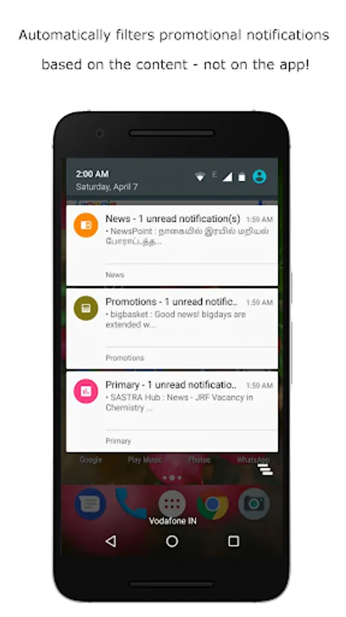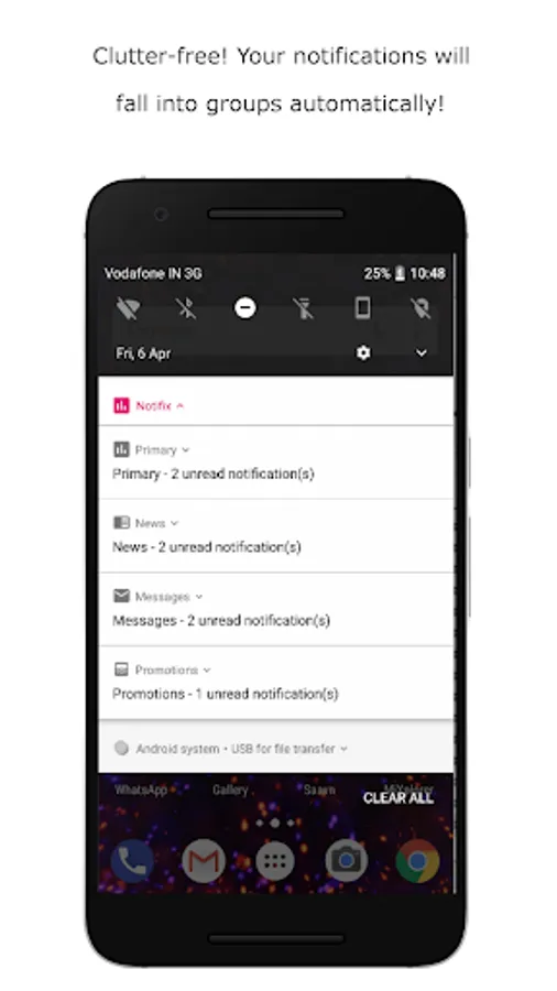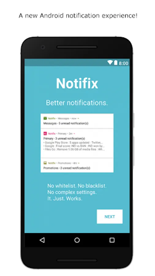 Notifix uses app type and processes notification content using machine learning to automatically group notifications into their respective categories - not just based on the app's name.