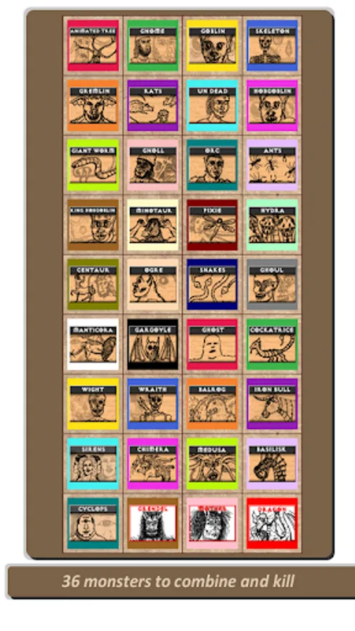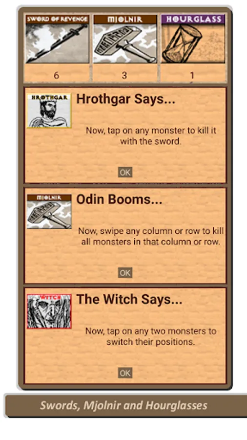 How do you play Grendel36? You swipe the screen up, down, left and right on a 4x4 game board to combine monster tiles of the same kind. When two of the same kind of monsters touch and combine they die and spawn the next higher value monster in their place. After each move a new monster tile randomly appears on an empty spot on the board. Keep sliding monsters to combine them into higher and higher value monsters, until you combine the two highest value monsters for the level and advance to the next level . You earn magical weapons by combining three or more of the same monsters in a row. Use these magical weapons to cheat the game. You can use swords to strike and kill a monster directly. You can use Thor’s Hammer, Mjolnir, to strike an entire row or column of monsters and kill them all. You can use the Witch’s magical Hourglass to switch the position of monsters on the board and create more and better moves in the game.