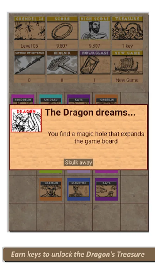 As you advance from one level to the next you gain more bonus weapons and even keys to the Dragon’s treasure. Use the keys for a chance to steal items from the treasure, swords, Mjolnir, Hourglasses and perhaps, if you are lucky, a Magic Hole that will increase the game board size to 5x5 or even bigger.