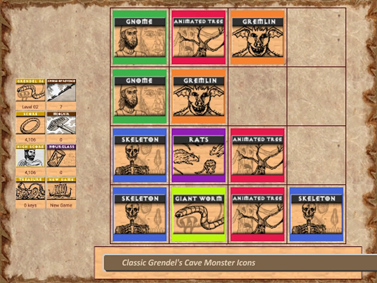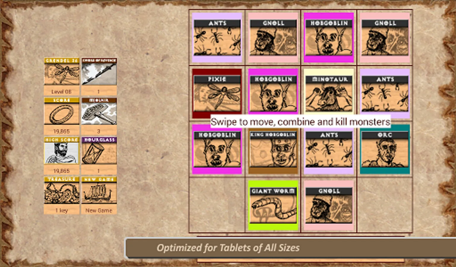 Grendel36 is a mashup of the popular 2048 style tile game and the legacy online game Grendel’s Cave, creating Grendel36 2048! Are you ready for the fun of the classic 2048 puzzle with the added excitement and strategy of earning magical weapons and using these to kill monsters and even switch monster positions on the game board? Are you ready to face Grendel, build an amulet by combining monsters, kill Grendel and win the Game? Are you ready to face Grendel’s Mother, build the Giant Sword and kill her? Are you ready to kill the Dragon, become a dragon slayer hero and make it to Valhalla?