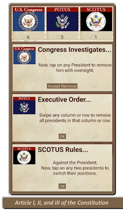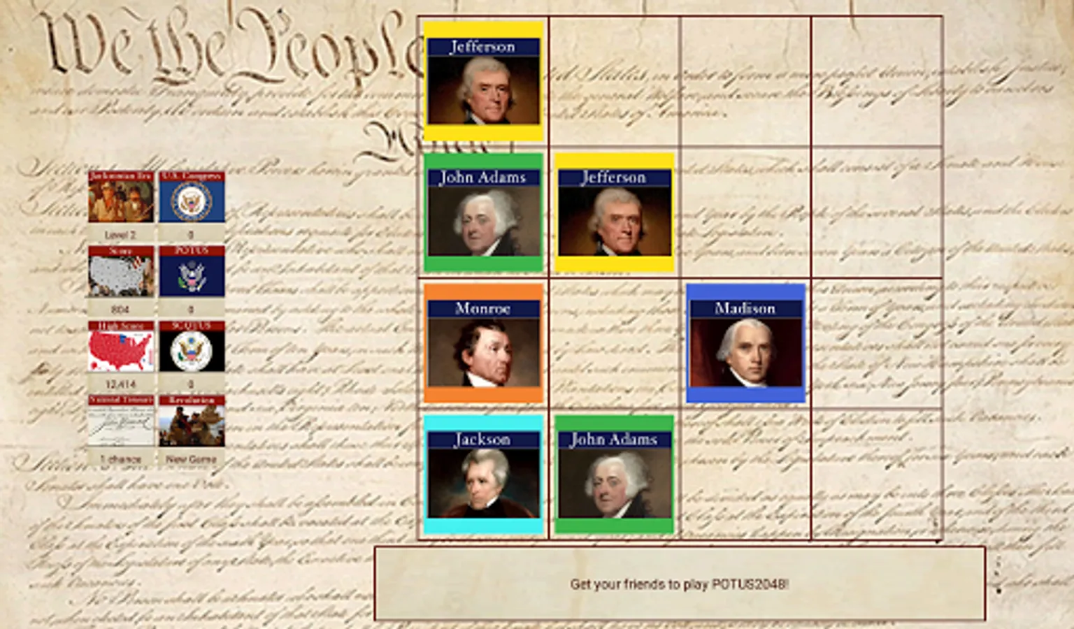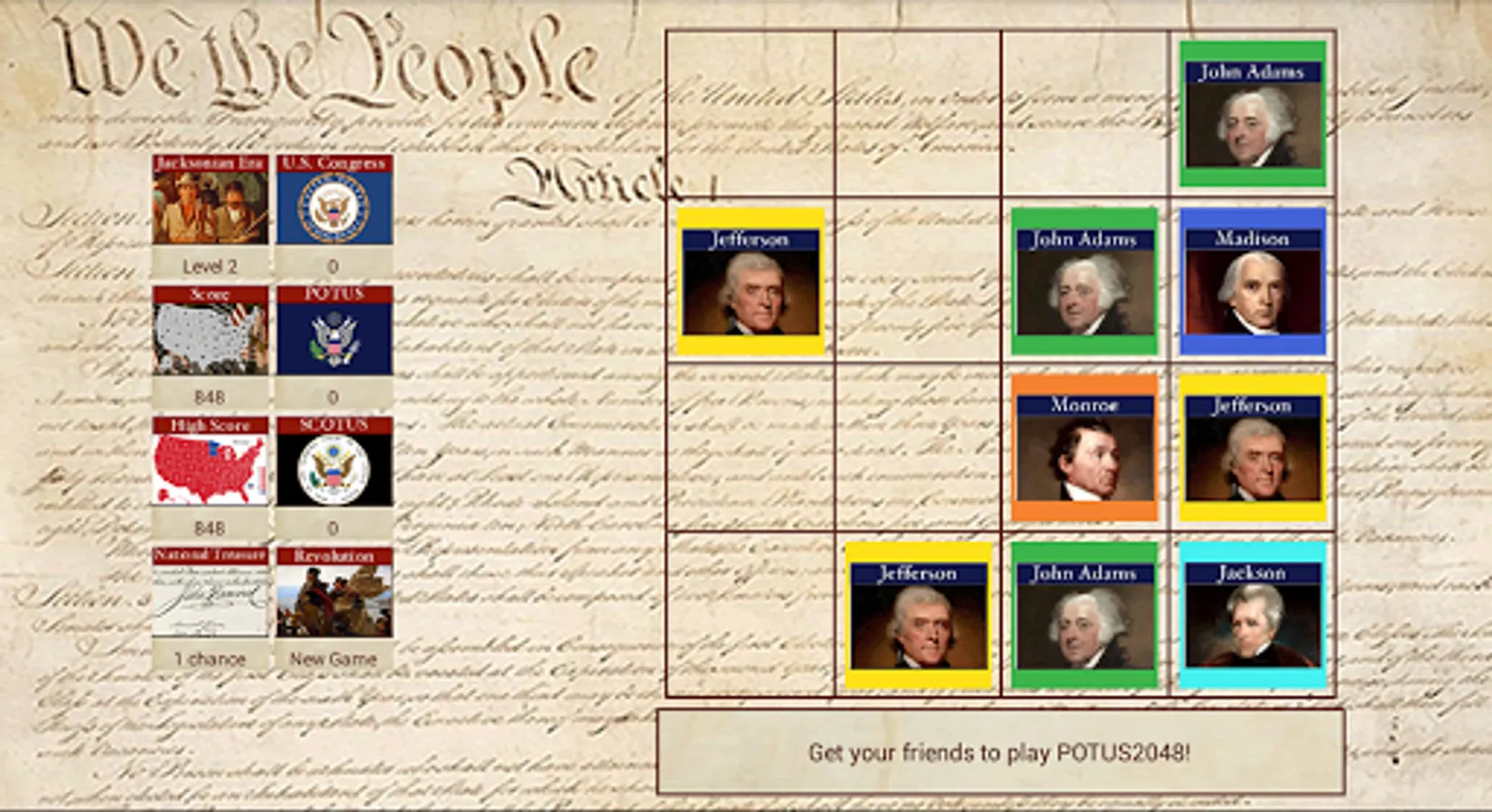 Are you ready for the fun of the classic 2048 puzzle game with the added excitement and strategy of earning constitutional checks on executive power and using them to remove presidents and even switch president positions on the game board? Are you ready to advance through 17 levels of U.S. historical eras, advance through all U.S. presidents and win the Game? Are you ready to play three levels of 2048 and one level of 4096 to win and reach the end of the game?