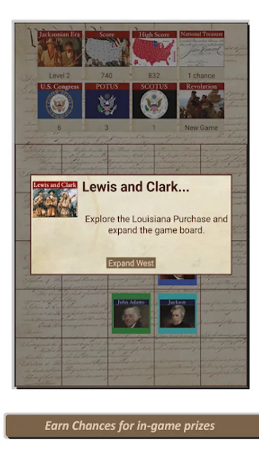 There are 17 levels of U.S. historical eras. Advance through the historical eras to higher value presidents, earning awards along the way, and building a higher and higher score, possible surpassing the highest score. As you advance from one level to the next you gain more bonus powers and even chances to use the National Treasure. Use these National Treasure chances to get more powers and perhaps, if you are lucky, win the Louisiana Purchase that increases the game board size to 5x5 or even bigger.