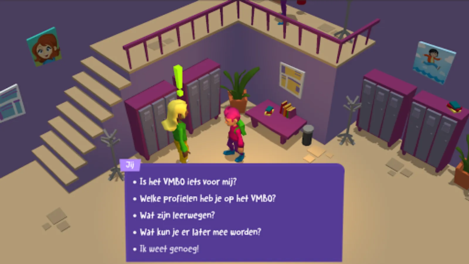GoVMBO is a 'point and click' adventure game. You explore include your bedroom and home, the school and the classrooms in the school. Each of the 10 sections VMBO has its own room, each with its own puzzle. Solve the puzzle to unlock more information about the profile.