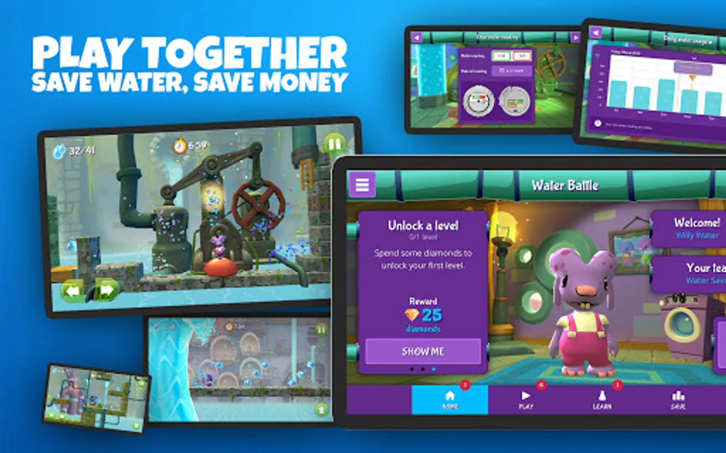 You’re helping tiny creatures that are living around us. Our water usage greatly impacts their world. You can play a few platform or runner levels every week. But to unlock all levels and be the best in the weekly tournament, you have to play together to save water, earn diamonds and unlock everything!