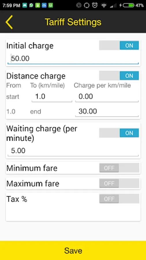 6. Tariff Settings - Update Minimum and Maximum Fare, Taxes, Fare per KM/Miles etc.