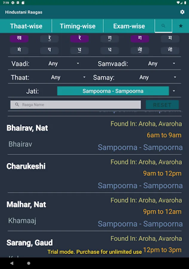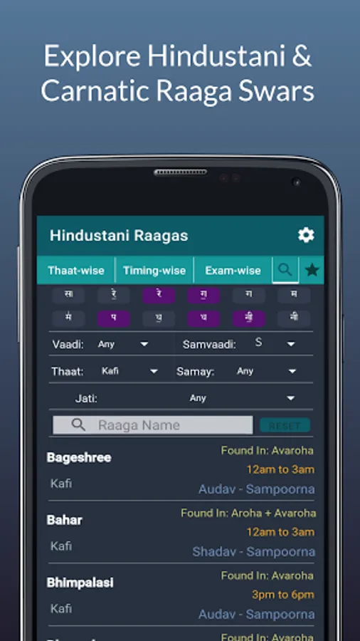✔ It helps you search Raagas by their notes in both Carnatic & Hindustani scales