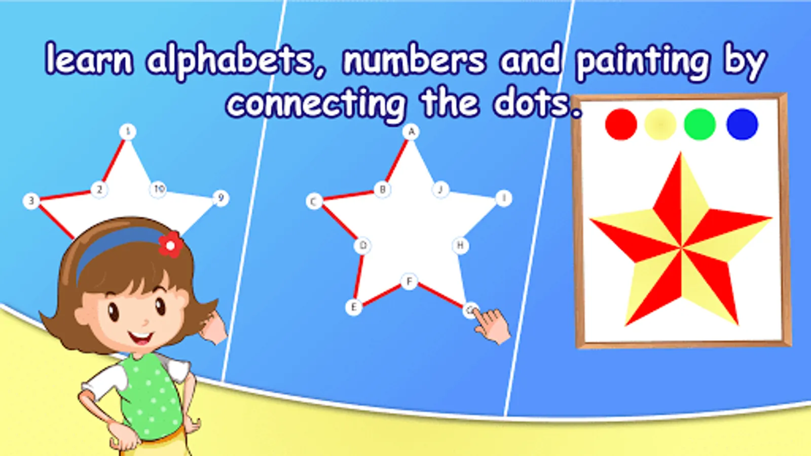 Connect the dots - ABC Kids Games is an educational fun learning dot 2 dot game for toddlers, preschoolers and kindergartners. Reveal the pictures that are hidden in the beautiful scene by connecting the dots of English Alphabets and numbers. Once the hidden picture is revealed, the child can color it to reinforce the learning. The child can trace English Alphabets and play car racing game.