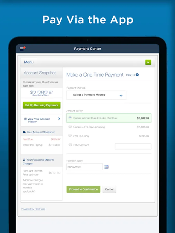 • Pay rent right from the app with your credit card, debit card or e-check and set up scheduled payments to avoid late fees