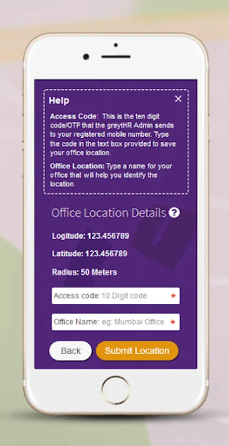 Use this app along with the OTP (access code) to register a new office location that is bound to your greytHR account. The selected office GPS cooordinates, radius and location name are uploaded to the greytHR application.