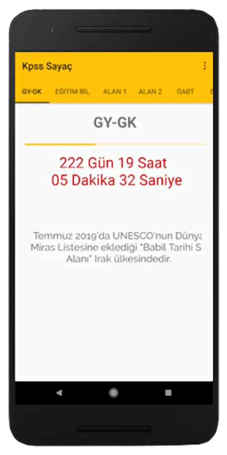 KPSS exam includes General Talent-General Culture, Educational Sciences, Field Knowledge 1, Field Knowledge 2, Teaching Field Knowledge Test, EKPSS, Associate Degree KPSS and Secondary Education KPSS countdown counters. It also provides preparation for general culture questions with current general culture information shown on each tab. Does not include lectures or test exams.