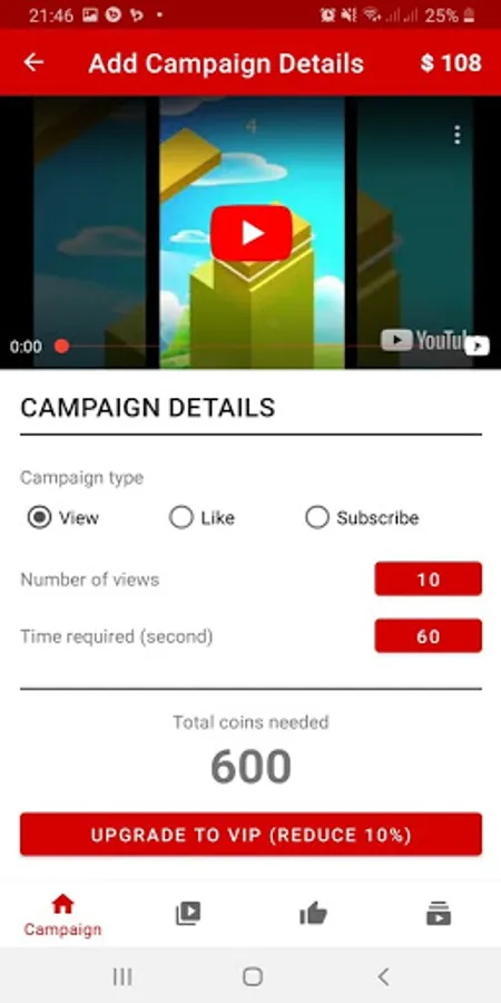You need to collect coin to create your campaign by views or likes video and subscribe other channels.