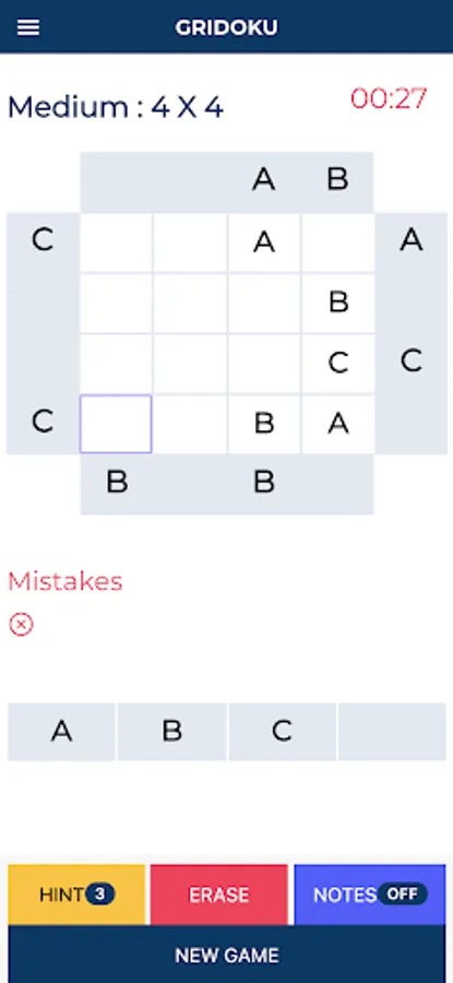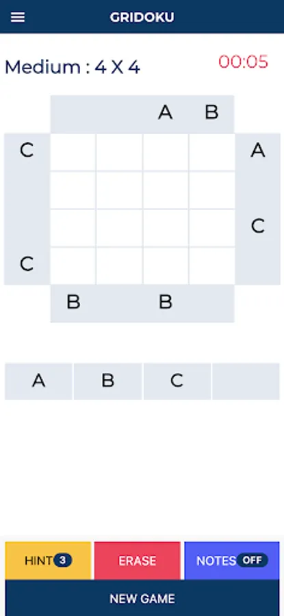 Gridoku is a logic puzzle that is based on the logical placement of letters within a square grid. An online game of logic, Gridoku does not require any calculation nor any advanced technical skills; all that is needed are practice, logical thinking, and concentration