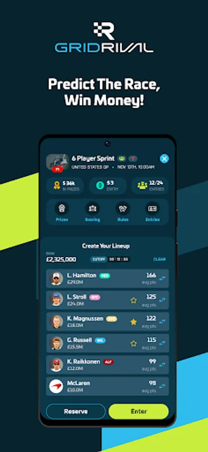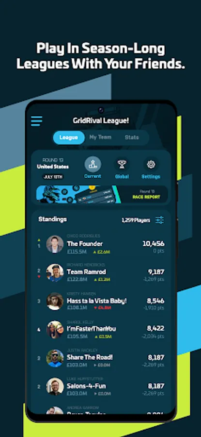 Join a league with fellow racing fans or friends and build your fantasy lineup. Your fantasy team will earn points based on the real-world results of race events. We promise that GridRival will make each race more fun!