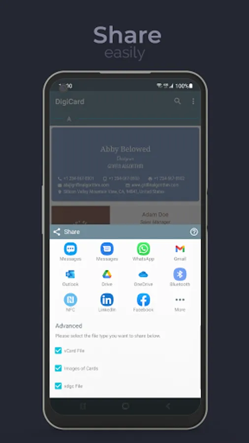 • Share vCard:When you share your card, vcard file will be sent also. So, people who does not use DigiCard can save your contact information easily.